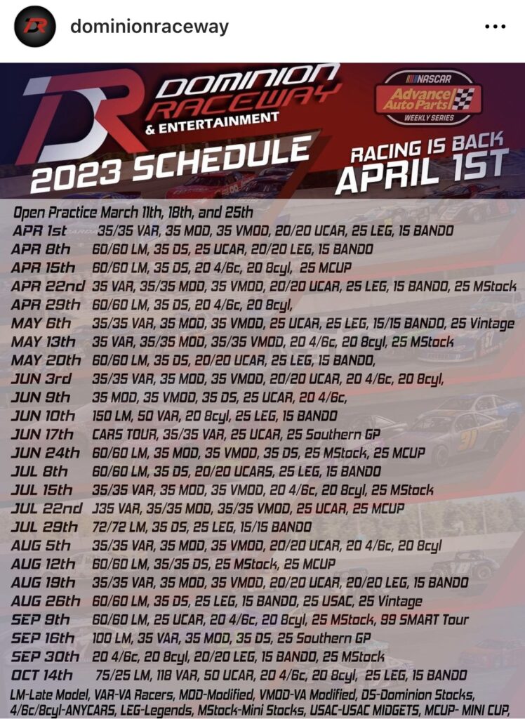 35 VAR, 35/35 MOD, 35/35 VMOD, 20 4/6c, 20 8cyl, 25 MStock more details at https://www.dominionraceway.com/oval-track-schedule