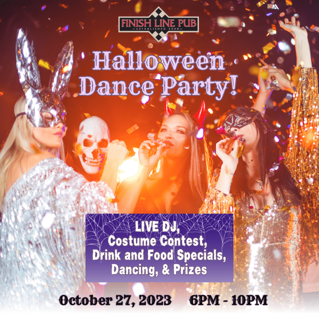Join us for a night of frightful fun at the Finish Line Pub’s Halloween Dance Party from 6pm – 10pm on Friday, October 27th. Open to the public, this night will feature a live DJ, a Haunting Hour all night with specialty cocktails at our cash bar and food specials, a costume contest, prizes, and DANCING! So come in your spookiest attire for a chance to win the GRAND PRIZE and gather all your friends for a night of ghoulish delight!