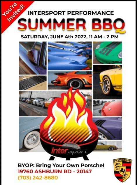 Intersport Performance 19760 Ashburn Rd, Ashburn, VA, United StatesLong time PCA Potomac sponsor Intersport Performance will be holding a BBQ this Saturday, June 4th, at their Ashburn location. Bring your Porsche and enjoy!
