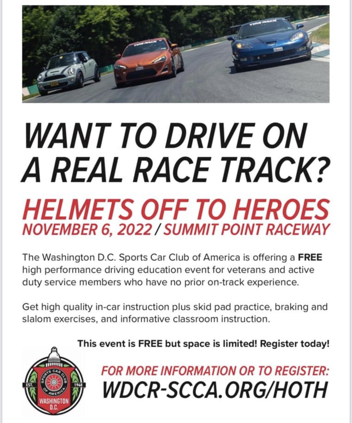 Summit Point Motorsports Park 201 Motorsports Circle, Summit Point, WV, United StatesTo thank our Veterans and Active Duty military, the Washington DC Region SCCA is announcing our annual "Helmets Off To Heroes 2023" free High Performance Driving Event, November 11th on the Summit Point Shenandoah Circuit, located at Summit Point WV. This free event is for Veterans and Active Duty military, to participate as a driver please bring […]