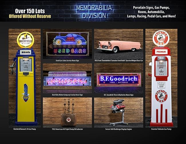 While several items and vehicles take our breath away, a few stand out. Lot 606, for example, is a super cool electric car that no one will argue about. Built by McLaren Restorations, this Porsche Speedster go-kart looks the part of every motorists fantasy, just at scale size. Another great item is Lot 3053, a Goodyear Tires porcelain neon vertical sign. As colorful as can be, it stands 94-inches tall (nearly 8-feet) and is complete with unique font styles and the winged foot logo. Lot 3057 is a gem in the rough. An American 48 Triple Pump Oil Lubester from 1922, it’s set up with the Texaco logo and being unrestored it shows a lot of patina. Complete with the three hand crank pumps for three separate containers, the sale includes the original Texaco plate as well as a copy of the period ad.